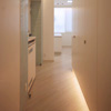 待合室から診療室へ、ライトブルーのタイルで壁面を仕上げ、軽いガラスの扉で仕切ることで狭い待合室を視覚的に広げました。 診療室はオープンでありながら、個室感を出すように、キャビネットで仕切り、開放感と個室感を共存させています。 収納の下の間接照明や、受付カウンターのステンレスなど、浮遊感を出すことを意識しました。