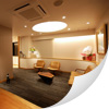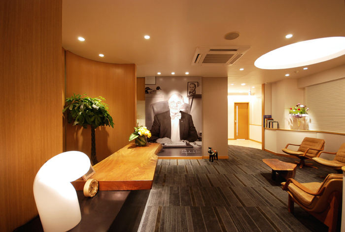 既存のプランを活かした改装です。 エントランスから入った突き当たりの壁面に医院名の由来でもあるブローネマルク氏の写真を配置し、患者様をお出迎えします。 既存で使用されていた一枚板のカウンター天板を再利用し、カウンターを製作しています。