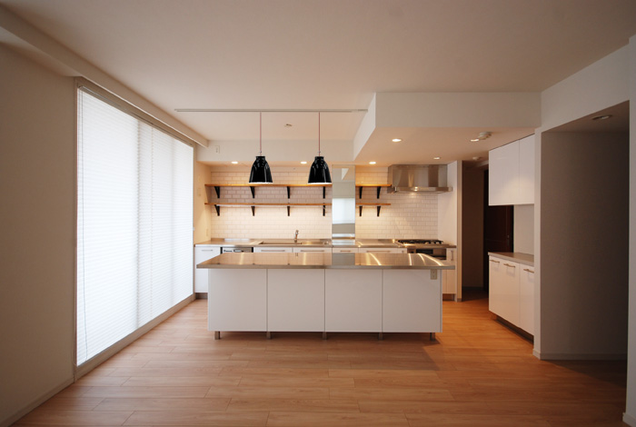 ダイニング及びキッチンのリフォーム L字でダイニングと隔たり感のあった既存のキッチンを大きく開放感のあるアイランドキッチンへと改装しました。 ローコストでできるようキッチンキャビネットはIKEAで組み、天板は大きなステンレスをオリジナル製作しています。 ナチュラルカラーの幅広フローリングと、白、ステンレスの組み合わせにアクセントとして黒を入れています。 凹凸のあるタイルが光を広い表情を与えてくれています。